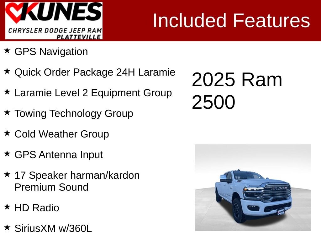 2025 Ram 2500 Laramie Laramie 4WD Dealer Discount of $9,613 off MSRP Bright White Clearcoat #1 Seat Foam Cushion, 115V Auxiliary Rear Power Outlet, 14.4" Touchscreen Display, 17 Speaker harman/kardon Premium Sound, 2 Way Rear Headrest Seat, 2nd Row In Floor Storage Bins, 4 Way Front Headrests, 4G LTE Wi-Fi Hot Spot, Alexa Built-In, Anti-Spin Differential Rear Axle, Apple CarPlay, Auto Adjust In Reverse Exterior Mirrors, Auto Dim Exterior Mirror, Auto High Beam Headlamp Control, Auto Power-Folding Mirrors, Auto-Dimming Exterior Passenger Mirror, Bucket Seats, Chrome Exterior Mirrors, Cold Weather Group, Connected Travel & Traffic Services, Connectivity - US/Canada, CTR Stop Lamp w/Cargo View Camera, Disassociated Touchscreen Display, Dual Wireless Charging Pad, Emergency Vehicle Alert System (EVAS), Engine Block Heater, Exterior Mirrors Courtesy Lamps, Exterior Mirrors w/Heating Element, Exterior Mirrors w/Memory, Exterior Mirrors w/Supplemental Signals, Foam Bottle Insert (Door Trim Panel), Folding Flat Load Floor Storage, Forward & Reverse Utility Lights, Front Seat Back Map Pockets, Full Length Upgraded Floor Console, Global Telematics Box Module (TBM), Google Android Auto, GPS Antenna Input, GPS Navigation, HD Radio, Heated Front Seats, Heated Steering Wheel, High Back Seats, Integrated Voice Command w/Bluetooth, Laramie Level 2 Equipment Group, Leather Trimmed Bucket Seats, Mirror Running Lights, MOPAR Winter Front Grille Cover, Off-Road Info Pages, Power 2-Way Driver Lumbar Adjust, Power 2-Way Passenger Lumbar Adjust, Power Adjust 8-Way Driver Seat, Power Adjust 8-Way Front Passenger Seat, Power Adjust Mirrors, Power Adjustable Convex Aux Mirrors, Power Adjustable Pedals w/Memory, Power Heated Fold Telescopic Mirrors w/Memory, Power Telescoping Mirrors, Quick Order Package 24H Laramie, Radio: Uconnect 5 Nav w/14.4" Display, Rain Sensitive Windshield Wipers, Rear 60/40 Folding Seat, Remote Tailgate Release, Selectable Tire Fill Alert, SiriusXM Radio Service, SiriusXM w/360L, Surround View Camera System, Towing Technology Group, Trailer Reverse Guidance, Trailer Tire Pressure Monitoring System, Trailer Tow Pages. 8-Speed Automatic 6.7L I6