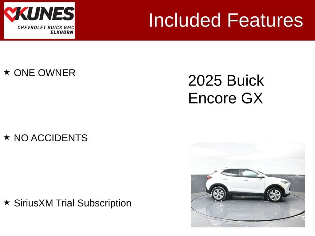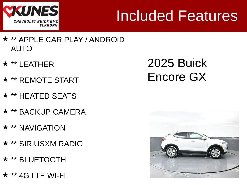 ** APPLE CAR PLAY / ANDROID AUTO, ** LEATHER, ** REMOTE START, ** HEATED SEATS, ** BACKUP CAMERA, ** NAVIGATION, ** SIRIUSXM RADIO, ** BLUETOOTH, ** 4G LTE WI-FI, ONE OWNER, NO ACCIDENTS, SiriusXM Trial Subscription.Certified. Certification Program Details:** NO FEAR LIFETIME CERTIFIED PREOWNED **Over $2,895 of value at no cost!*LIFETIME WARRANTY!*3 Day Exchange Policy!*Complimentary powertrain warranty with ability to upgrade to fully comprehensive coverage and/or extend up to 125,000 miles!*125+ Point Inspection by our factory trained ASE Certified technicians and reconditioned to the highest standards.*Complimentary AutoCheck History Report*Complimentary AutoCheck Buyback Protection*Financing for Everyone - Guaranteed credit approval regardless of credit history!*Over 30 lenders who compete to get you the best financing terms*No payments for up to 90 days!*Weekly, Bi-Weekly, and Monthly Payment Options for all buyers!*First Free Oil Change!*Trade anytime policy - cars, trucks, boats, RVs, motorcycles - as long as we donât have to feed it, you can trade it!2025 Buick Encore GX Preferred ECOTEC 1.2L Turbo CVT FWD Clean CARFAX. CARFAX One-Owner. 30/31 City/Highway MPGFind out why our dealerships have won DealerRater.com DEALER OF THE YEAR a whopping 10 TIMES! Call, email, or live chat with one of our friendly sales professionals now to schedule your test drive! Ask about some of our other Chevrolet, GMC, Buick, Ford, Chrysler, Dodge, Jeep, Ram, Tesla, Kia, Hyundai, INFINITI, BMW, Mercedes, Toyota, Lexus, Nissan, Volkswagen, Hummer, Lincoln, Mazda, Mitsubishi, Honda, Acura, and other vehicles that may have navigation, sunroof, adaptive cruise control, leather, cooled seats, blind spot monitor, lane keep assist, panoramic moonroof, tow hitch, Bose audio, Harman Kardon, Sony, remote start, AWD, all wheel drive, 4x4, wireless charging, sirius XM, heated seats, heated steering wheel, V8, diesel, chrome, bed-liner, luggage rack, sensing, power folding mirrors, 5th wheel, gooseneck, autopilot, self-driving, EV, remote locking tailgate, LT, LTZ, High Country, LX, EX, EX-L, DVD, rear entertainment, rear bucket seats, S, SV, SL, premium, black edition, soft top, hard top, convertible, rally stripes, GT, Shelby, Z71, XL, XLT, Lariat, Denali, SLT, SLE, RS, Rebel, Preferred, Premier, Essence, Limited, Luxury, and more. Prices shown do not include tax, title, registration and $499 service fees.
