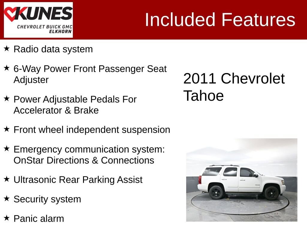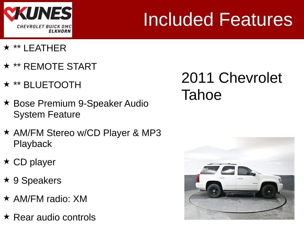 ** LEATHER, ** REMOTE START, ** HEATED SEATS, ** BACKUP CAMERA, ** BLUETOOTH, 4WD, Ebony Leather, 6-Way Power Driver Seat Adjuster, 6-Way Power Front Passenger Seat Adjuster, 9 Speakers, AM/FM radio: XM, AM/FM Stereo w/CD Player & MP3 Playback, Bose Premium 9-Speaker Audio System Feature, CD player, Compass, Driver Manual Lumbar Control, Emergency communication system: OnStar Directions & Connections, Floor Console, Front Bucket Seats, Front Center Armrest, Front Reclining Bucket Seats, Front wheel independent suspension, Outside temperature display, Overhead console, Panic alarm, Power Adjustable Pedals For Accelerator & Brake, Power Heated Manual-Folding Outside Mirrors, Radio data system, Rear audio controls, Rear seat center armrest, Rear window wiper, Roof rack, Security system, Spoiler, Tachometer, Trip computer, Ultrasonic Rear Parking Assist, Voltmeter.2011 Chevrolet Tahoe LT Vortec 5.3L V8 SFI Flex Fuel Iron Block 6-Speed Automatic Electronic with Overdrive 4WDAwards:* JD Power Initial Quality StudyFind out why our dealerships have won DealerRater.com DEALER OF THE YEAR a whopping 10 TIMES! Call, email, or live chat with one of our friendly sales professionals now to schedule your test drive! Ask about some of our other Chevrolet, GMC, Buick, Ford, Chrysler, Dodge, Jeep, Ram, Tesla, Kia, Hyundai, INFINITI, BMW, Mercedes, Toyota, Lexus, Nissan, Volkswagen, Hummer, Lincoln, Mazda, Mitsubishi, Honda, Acura, and other vehicles that may have navigation, sunroof, adaptive cruise control, leather, cooled seats, blind spot monitor, lane keep assist, panoramic moonroof, tow hitch, Bose audio, Harman Kardon, Sony, remote start, AWD, all wheel drive, 4x4, wireless charging, sirius XM, heated seats, heated steering wheel, V8, diesel, chrome, bed-liner, luggage rack, sensing, power folding mirrors, 5th wheel, gooseneck, autopilot, self-driving, EV, remote locking tailgate, LT, LTZ, High Country, LX, EX, EX-L, DVD, rear entertainment, rear bucket seats, S, SV, SL, premium, black edition, soft top, hard top, convertible, rally stripes, GT, Shelby, Z71, XL, XLT, Lariat, Denali, SLT, SLE, RS, Rebel, Preferred, Premier, Essence, Limited, Luxury, and more. Prices shown do not include tax, title, registration and $599 service fees.