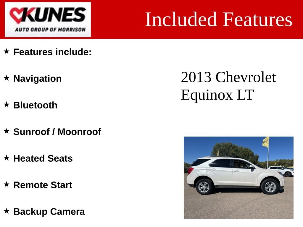 White 2013 Chevrolet Equinox Pricing includes $2000 Trade In Assistance, and incentive to finance with Dealership. Must trade in 10 year or newer vehicle with less than 100,000 miles. Features include:, Navigation, Bluetooth, Sunroof / Moonroof, Heated Seats, Remote Start, Backup Camera, Equinox LT 2LT, 4D Sport Utility, FWD, White, Cloth. Recent Arrival! Odometer is 41262 miles below market average!
