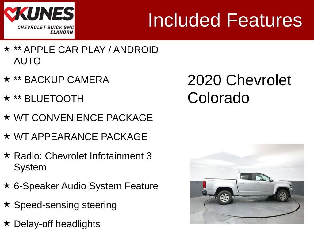 ** APPLE CAR PLAY / ANDROID AUTO, ** BACKUP CAMERA, ** BLUETOOTH, WT CONVENIENCE PACKAGE, WT APPEARANCE PACKAGE, 4WD, 6-Speaker Audio System Feature, Delay-off headlights, Extended Range Remote Keyless Entry, Outside Power-Adjustable Body-Color Mirrors, Radio: Chevrolet Infotainment 3 System, Speed-sensing steering, Tow/Haul Mode, Wheels: 16 x 7 Ultra Silver Metallic Cast Alloy.