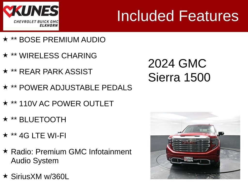 ** SUNROOF, ** APPLE CAR PLAY / ANDROID AUTO, ** LEATHER, ** REMOTE START, ** HEATED SEATS, ** HEATED/COOLED SEATS, ** BACKUP CAMERA, ** NAVIGATION, ** SIRIUSXM RADIO, ** BOSE PREMIUM AUDIO, ** WIRELESS CHARING, ** REAR PARK ASSIST, ** POWER ADJUSTABLE PEDALS, ** 110V AC POWER OUTLET, ** BLUETOOTH, ** 4G LTE WI-FI, 10-Speed Automatic, 4WD, Black Leather, 12-Way Power Driver Seat Adjuster w/Lumbar, 12-Way Power Passenger Seat Adjuster w/Lumbar, 120-Volt Bed Mounted Power Outlet, 120-Volt Interior Power Outlet, 2 Charge/Data USB Ports Inside Center Console, 2 Type-C Charge-Only Rear USB Ports, 2 USB Ports, 3.23 Rear Axle Ratio, 7 Speakers, Adaptive suspension, Alloy wheels, AM/FM radio: SiriusXM with 360L, Auto-dimming door mirrors, Buckle to Drive, Bumpers: body-color, Chrome Header w/Signature Denali Chrome Grille, Chrome Recovery Hooks, Chrome Wheel To Wheel Assist Steps, Color-Keyed Carpeting Floor Covering, Compass, Delay-off headlights, Denali Premium Suspension w/Adaptive Ride Control, Driver door bin, Driver vanity mirror, Dual front side impact airbags, Electric Rear-Window Defogger, Emergency communication system: OnStar and GMC connected services capable, Floor-Mounted Center Console, Forge Perforated Leather Seat Trim, Front Bucket Seats, Front Center Armrest, Front dual zone A/C, Front Rain-Sensing Wipers, Front reading lights, Front wheel independent suspension, Garage door transmitter, Genuine wood console insert, Genuine wood dashboard insert, Genuine wood door panel insert, GMC Connected Access Capable, GMC MultiPro Power Steps, HD Surround Vision, Heated 2nd Row Outboard Seats, Heated front seats, Heated rear seats, Heated steering wheel, Hill Descent Control, Hitch Guidance, Hitch View, Illuminated entry, In-Vehicle Trailering System App, Integrated Trailer Brake Controller, Keyless Open & Start, LED Cargo Area Lighting, Low tire pressure warning, Occupant sensing airbag, OnStar & GMC Connected Services Capable, Outside temperature display, Overhead airbag, Overhead console, Panic alarm, Passenger door bin, Passenger vanity mirror, Power door mirrors, Power Front Passenger Windows w/Express Up/Down, Power Front Windows w/Driver Express Up/Down, Power passenger seat, Power Rake & Telescoping Steering Column, Power Rear Windows w/Express Down, Power Sliding Rear Window w/Rear Defogger, Premium Bose 7-Speaker Sound System, Radio data system, Radio: Premium GMC Infotainment Audio System, Rear Camera Mirror, Rear Pedestrian Detection, Rear reading lights, Rear seat center armrest, Rear step bumper, Rear Wheelhouse Liners, Rear window defroster, Safety Alert Seat, SiriusXM w/360L, Speed-sensing steering, Split folding rear seat, Spray-On Pickup Bedliner w/Denali Logo, Tachometer, Telescoping steering wheel, Theft Deterrent System (Unauthorized Entry), Tilt steering wheel, Trailer Camera Provisions, Trailer Side Blind Zone Alert, Trip computer, Ultrasonic Front & Rear Park Assist, Universal Home Remote, Ventilated Driver & Front Passenger Seats, Ventilated front seats, Wheel Locks (Set of 4) (LPO), Wheels: 20 x 9 Multi-Dimensional Polished Alum, Wheels: 22 x 9 Painted Aluminum, Wi-Fi Hotspot Capable, Wireless Charging.