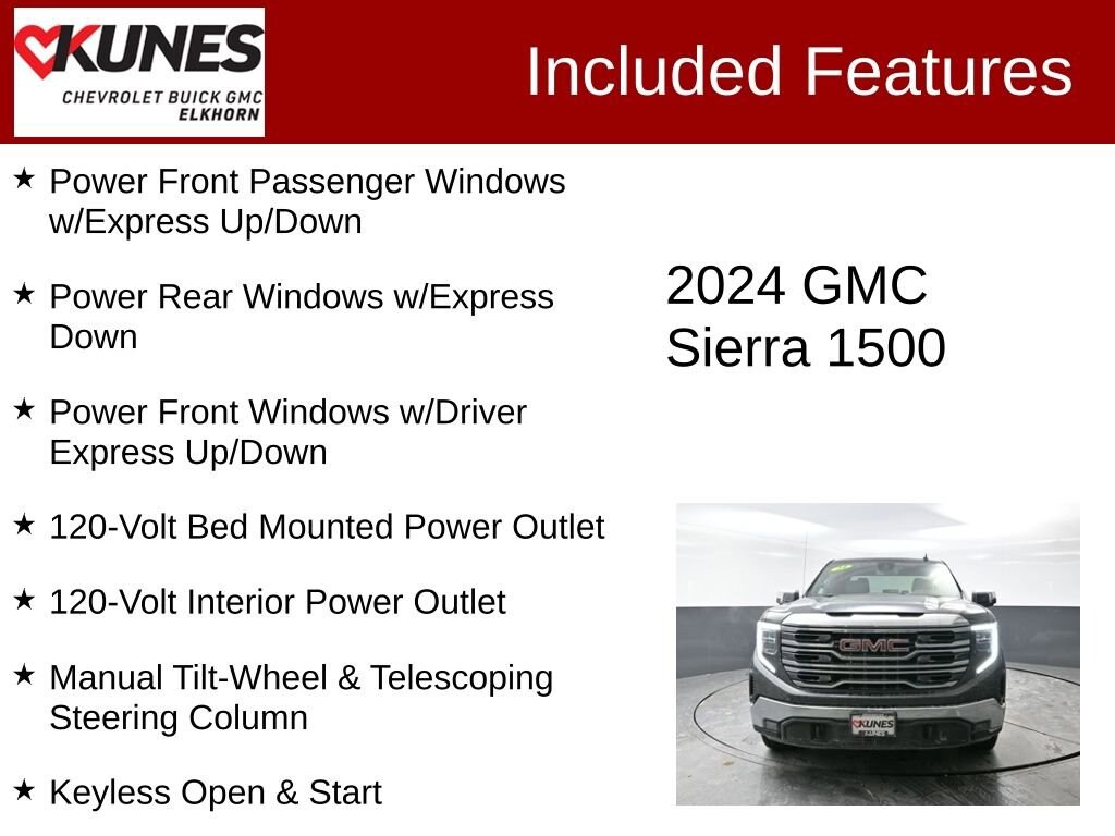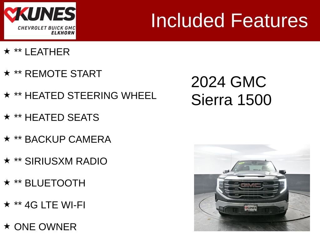 ** LEATHER, ** REMOTE START, ** HEATED STEERING WHEEL, ** HEATED SEATS, ** BACKUP CAMERA, ** SIRIUSXM RADIO, ** BLUETOOTH, ** 4G LTE WI-FI, ONE OWNER, 10-Speed Automatic, 4WD, Dark Walnut/Slate Leather, 10-Way Power Driver Seat Adjuster w/Lumbar, 10-Way Power Passenger Seat Adjuster w/Lumbar, 120-Volt Bed Mounted Power Outlet, 120-Volt Interior Power Outlet, 2 Charge/Data USB Ports, 2 Type-C Charge-Only Rear USB Ports, Apple CarPlay/Android Auto, Auxiliary External Transmission Oil Cooler, Compass, Delay-off headlights, Driver door bin, Driver vanity mirror, Front Center Armrest w/Storage, Front reading lights, GMC Connected Access Capable, Illuminated entry, Keyless Open & Start, LED Cargo Area Lighting, Manual Tilt-Wheel & Telescoping Steering Column, OnStar & GMC Connected Services Capable, Outside temperature display, Overhead console, Passenger door bin, Passenger vanity mirror, Perimeter Lighting, Power door mirrors, Power Front Passenger Windows w/Express Up/Down, Power Front Windows w/Driver Express Up/Down, Power Rear Windows w/Express Down, Rear reading lights, Rear seat center armrest, Rear step bumper, Rear Wheelhouse Liners, Split folding rear seat, Tachometer, Telescoping steering wheel, Tilt steering wheel, Trip computer, Voltmeter, Wheels: 18 x 8.5 6-Spoke Machined Aluminum, Wi-Fi Hotspot Capable, Wireless Apple CarPlay/Wireless Android Auto.Certified. Certification Program Details:** NO FEAR LIFETIME CERTIFIED PREOWNED **Over $2,895 of value at no cost!*LIFETIME WARRANTY!*3 Day Exchange Policy!*Complimentary powertrain warranty with ability to upgrade to fully comprehensive coverage and/or extend up to 125,000 miles!*125+ Point Inspection by our factory trained ASE Certified technicians and reconditioned to the highest standards.*Complimentary AutoCheck History Report*Complimentary AutoCheck Buyback Protection*Financing for Everyone - Guaranteed credit approval regardless of credit history!*Over 30 lenders who compete to get you the best financing terms*No payments for up to 90 days!*Weekly, Bi-Weekly, and Monthly Payment Options for all buyers!*First Free Oil Change!*Trade anytime policy - cars, trucks, boats, RVs, motorcycles - as long as we donât have to feed it, you can trade it!Priced below KBB Fair Purchase Price!2024 GMC Sierra 1500 SLT EcoTec3 5.3L V8 10-Speed Automatic 4WD CARFAX One-Owner. Odometer is 5414 miles below market average!Find out why our dealerships have won DealerRater.com DEALER OF THE YEAR a whopping 10 TIMES! Call, email, or live chat with one of our friendly sales professionals now to schedule your test drive! Ask about some of our other Chevrolet, GMC, Buick, Ford, Chrysler, Dodge, Jeep, Ram, Tesla, Kia, Hyundai, INFINITI, BMW, Mercedes, Toyota, Lexus, Nissan, Volkswagen, Hummer, Lincoln, Mazda, Mitsubishi, Honda, Acura, and other vehicles that may have navigation, sunroof, adaptive cruise control, leather, cooled seats, blind spot monitor, lane keep assist, panoramic moonroof, tow hitch, Bose audio, Harman Kardon, Sony, remote start, AWD, all wheel drive, 4x4, wireless charging, sirius XM, heated seats, heated steering wheel, V8, diesel, chrome, bed-liner, luggage rack, sensing, power folding mirrors, 5th wheel, gooseneck, autopilot, self-driving, EV, remote locking tailgate, LT, LTZ, High Country, LX, EX, EX-L, DVD, rear entertainment, rear bucket seats, S, SV, SL, premium, black edition, soft top, hard top, convertible, rally stripes, GT, Shelby, Z71, XL, XLT, Lariat, Denali, SLT, SLE, RS, Rebel, Preferred, Premier, Essence, Limited, Luxury, and more. Prices shown do not include tax, title, registration and $599 service fees.