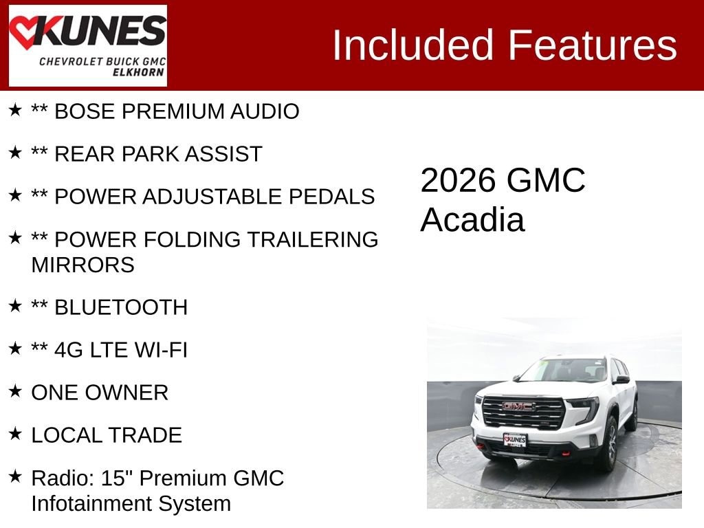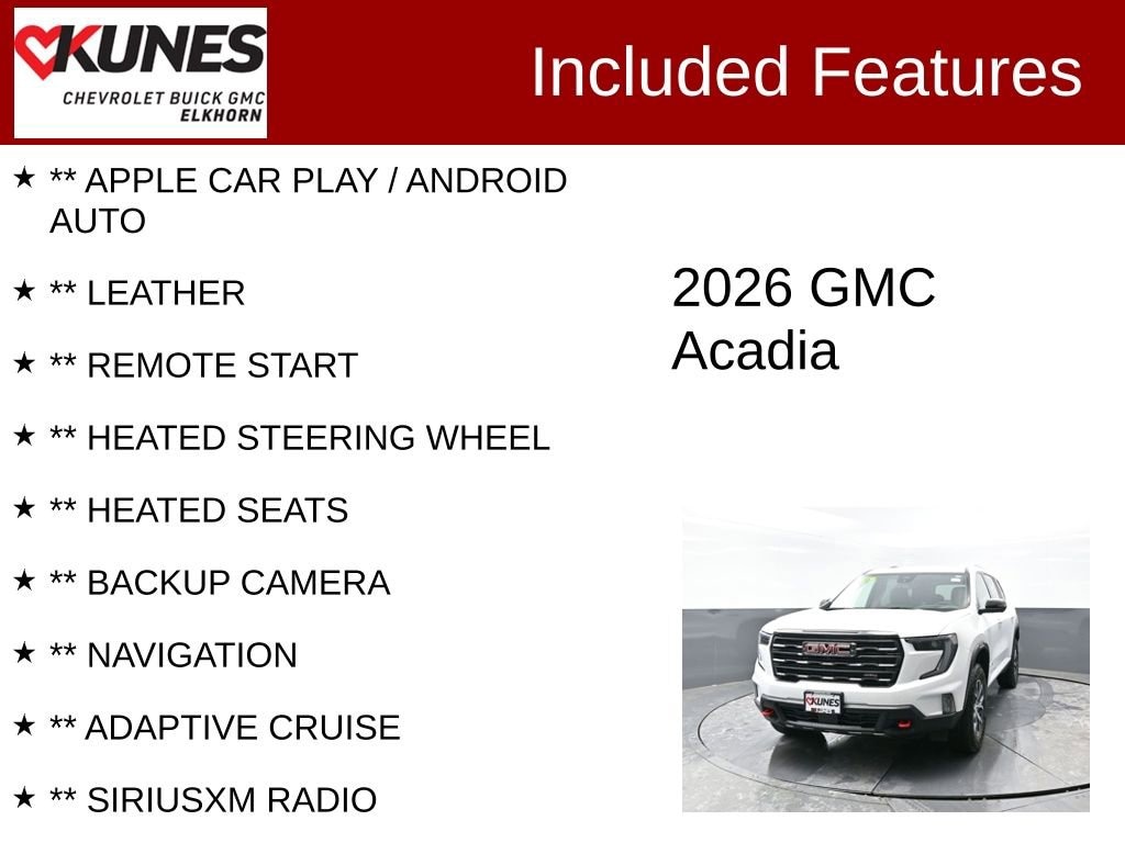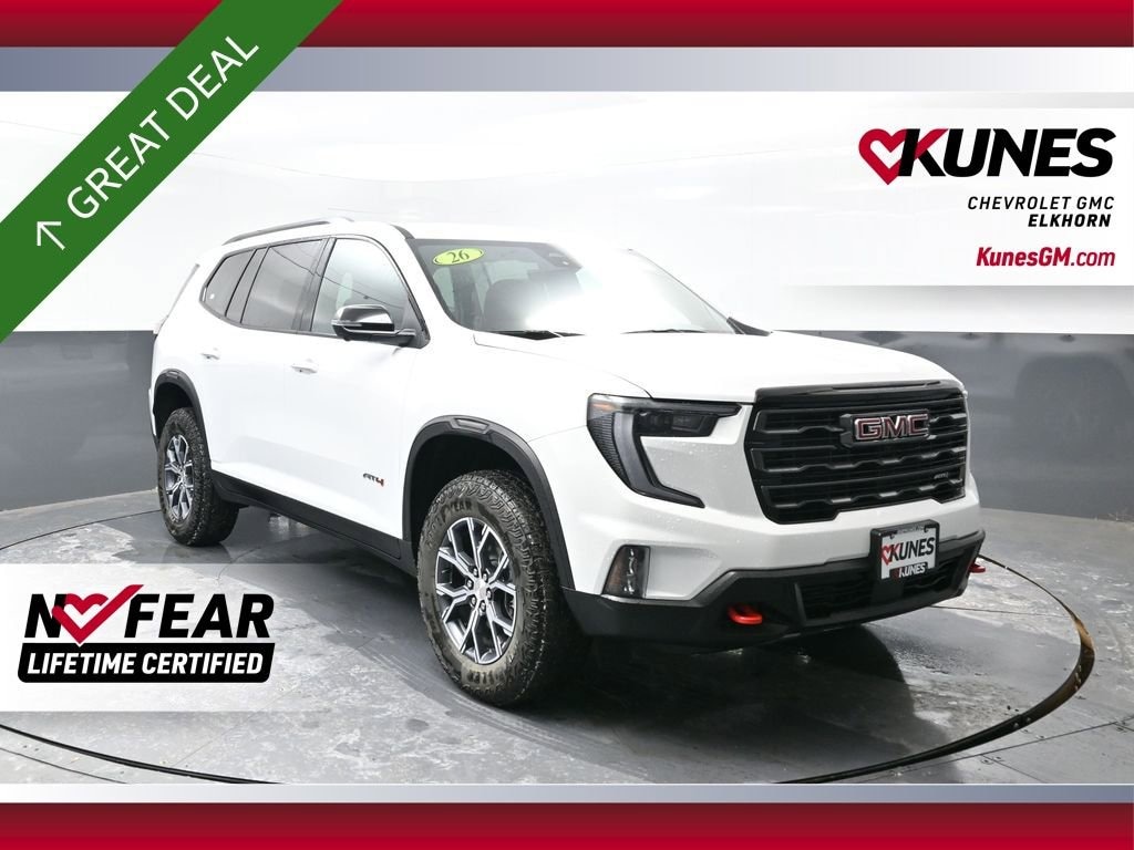 ** APPLE CAR PLAY / ANDROID AUTO, ** LEATHER, ** REMOTE START, ** HEATED STEERING WHEEL, ** HEATED SEATS, ** BACKUP CAMERA, ** NAVIGATION, ** ADAPTIVE CRUISE, ** SIRIUSXM RADIO, ** BOSE PREMIUM AUDIO, ** REAR PARK ASSIST, ** POWER ADJUSTABLE PEDALS, ** POWER FOLDING TRAILERING MIRRORS, ** BLUETOOTH, ** 4G LTE WI-FI, ONE OWNER, LOCAL TRADE, AWD, Forest Storm w/Mahogany Accents w/Cloth/CoreTec Seat Trim, 12 Speakers, 6-Way Power Front Passenger Seat Adjuster, Auto-dimming Rear-View mirror, Bose Premium 12-Speaker System w/Sub-Woofer, Compass, Delay-off headlights, Driver door bin, Front anti-roll bar, Front Center Armrest, Front fog lights, Garage door transmitter, Illuminated entry, Leather steering wheel, Occupant sensing airbag, Outside temperature display, Overhead console, Panic alarm, Passenger door bin, Passenger vanity mirror, Power steering, Radio: 15 Premium GMC Infotainment System, Rear anti-roll bar, Rear reading lights, Rear window wiper, Speed control, Speed-sensing steering, Spoiler, Sport steering wheel, Steering wheel mounted audio controls, Tachometer, Telescoping steering wheel, Tilt steering wheel, Trip computer, Voltmeter.Certified. Certification Program Details:** NO FEAR LIFETIME CERTIFIED PREOWNED **Over $2,895 of value at no cost!*LIFETIME WARRANTY!*3 Day Exchange Policy!*Complimentary powertrain warranty with ability to upgrade to fully comprehensive coverage and/or extend up to 125,000 miles!*125+ Point Inspection by our factory trained ASE Certified technicians and reconditioned to the highest standards.*Complimentary AutoCheck History Report*Complimentary AutoCheck Buyback Protection*Financing for Everyone - Guaranteed credit approval regardless of credit history!*Over 30 lenders who compete to get you the best financing terms*No payments for up to 90 days!*Weekly, Bi-Weekly, and Monthly Payment Options for all buyers!*First Free Oil Change!*Trade anytime policy - cars, trucks, boats, RVs, motorcycles - as long as we donât have to feed it, you can trade it!Priced below KBB Fair Purchase Price!2026 GMC Acadia AT4 2.5L DOHC 8-Speed Automatic AWD Clean CARFAX. CARFAX One-Owner. Odometer is 993 miles below market average!Find out why our dealerships have won DealerRater.com DEALER OF THE YEAR a whopping 10 TIMES! Call, email, or live chat with one of our friendly sales professionals now to schedule your test drive! Ask about some of our other Chevrolet, GMC, Buick, Ford, Chrysler, Dodge, Jeep, Ram, Tesla, Kia, Hyundai, INFINITI, BMW, Mercedes, Toyota, Lexus, Nissan, Volkswagen, Hummer, Lincoln, Mazda, Mitsubishi, Honda, Acura, and other vehicles that may have navigation, sunroof, adaptive cruise control, leather, cooled seats, blind spot monitor, lane keep assist, panoramic moonroof, tow hitch, Bose audio, Harman Kardon, Sony, remote start, AWD, all wheel drive, 4x4, wireless charging, sirius XM, heated seats, heated steering wheel, V8, diesel, chrome, bed-liner, luggage rack, sensing, power folding mirrors, 5th wheel, gooseneck, autopilot, self-driving, EV, remote locking tailgate, LT, LTZ, High Country, LX, EX, EX-L, DVD, rear entertainment, rear bucket seats, S, SV, SL, premium, black edition, soft top, hard top, convertible, rally stripes, GT, Shelby, Z71, XL, XLT, Lariat, Denali, SLT, SLE, RS, Rebel, Preferred, Premier, Essence, Limited, Luxury, and more. Prices shown do not include tax, title, registration and $599 service fees.