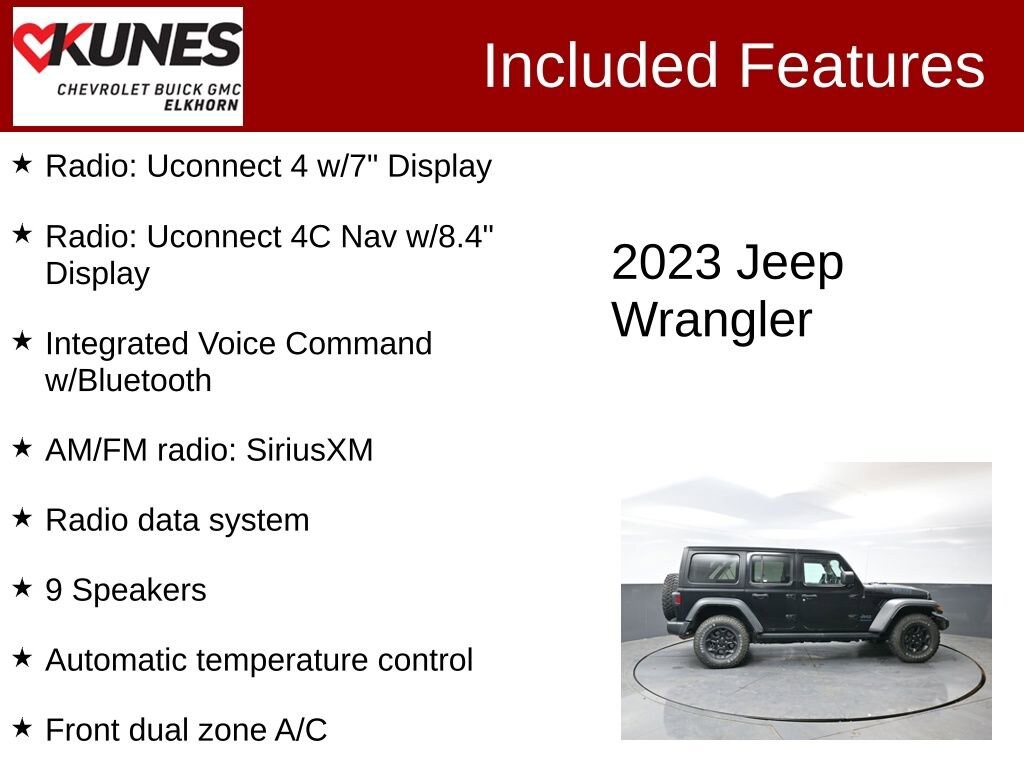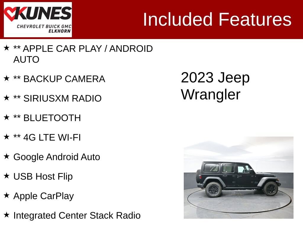 ** APPLE CAR PLAY / ANDROID AUTO, ** BACKUP CAMERA, ** SIRIUSXM RADIO, ** BLUETOOTH, ** 4G LTE WI-FI, BLACK 3-PIECE HARD TOP, WILLYS PACKAGE, 2.0L I4 DOHC, 4xe 4-Wheel Drive Swing Gate Decal, 9 Speakers, 97 MPH Vehicle Max Speed Calibration, AM/FM radio: SiriusXM, Apple CarPlay, Automatic temperature control, Black Grille, Delay-off headlights, Emergency communication system: SiriusXM Guardian, Front dual zone A/C, Front LED Fog Lamps, Google Android Auto, Integrated Center Stack Radio, Integrated roll-over protection, Integrated Voice Command w/Bluetooth, LED Headlamp & Fog Lamp Group, LED Premium Reflector Headlamps, MOPAR All-Weather Floor Mats, Normal Duty Suspension, Occupant sensing airbag, Radio data system, Radio: Uconnect 4 w/7 Display, Radio: Uconnect 4C Nav w/8.4 Display, Rear anti-roll bar, Rear reading lights, Steering wheel mounted audio controls, Telescoping steering wheel, USB Host Flip, Voltmeter.Certified. Certification Program Details:** NO FEAR LIFETIME CERTIFIED PREOWNED **Over $2,895 of value at no cost!*LIFETIME WARRANTY!*3 Day Exchange Policy!*Complimentary powertrain warranty with ability to upgrade to fully comprehensive coverage and/or extend up to 125,000 miles!*125+ Point Inspection by our factory trained ASE Certified technicians and reconditioned to the highest standards.*Complimentary AutoCheck History Report*Complimentary AutoCheck Buyback Protection*Financing for Everyone - Guaranteed credit approval regardless of credit history!*Over 30 lenders who compete to get you the best financing terms*No payments for up to 90 days!*Weekly, Bi-Weekly, and Monthly Payment Options for all buyers!*First Free Oil Change!*Trade anytime policy - cars, trucks, boats, RVs, motorcycles - as long as we donât have to feed it, you can trade it!2023 Jeep Wrangler Base 4xe 2.0L I4 DOHC 8-Speed Automatic 4WD Clean CARFAX. CARFAX One-Owner.Find out why our dealerships have won DealerRater.com DEALER OF THE YEAR a whopping 10 TIMES! Call, email, or live chat with one of our friendly sales professionals now to schedule your test drive! Ask about some of our other Chevrolet, GMC, Buick, Ford, Chrysler, Dodge, Jeep, Ram, Tesla, Kia, Hyundai, INFINITI, BMW, Mercedes, Toyota, Lexus, Nissan, Volkswagen, Hummer, Lincoln, Mazda, Mitsubishi, Honda, Acura, and other vehicles that may have navigation, sunroof, adaptive cruise control, leather, cooled seats, blind spot monitor, lane keep assist, panoramic moonroof, tow hitch, Bose audio, Harman Kardon, Sony, remote start, AWD, all wheel drive, 4x4, wireless charging, sirius XM, heated seats, heated steering wheel, V8, diesel, chrome, bed-liner, luggage rack, sensing, power folding mirrors, 5th wheel, gooseneck, autopilot, self-driving, EV, remote locking tailgate, LT, LTZ, High Country, LX, EX, EX-L, DVD, rear entertainment, rear bucket seats, S, SV, SL, premium, black edition, soft top, hard top, convertible, rally stripes, GT, Shelby, Z71, XL, XLT, Lariat, Denali, SLT, SLE, RS, Rebel, Preferred, Premier, Essence, Limited, Luxury, and more. Prices shown do not include tax, title, registration and $599 service fees.
