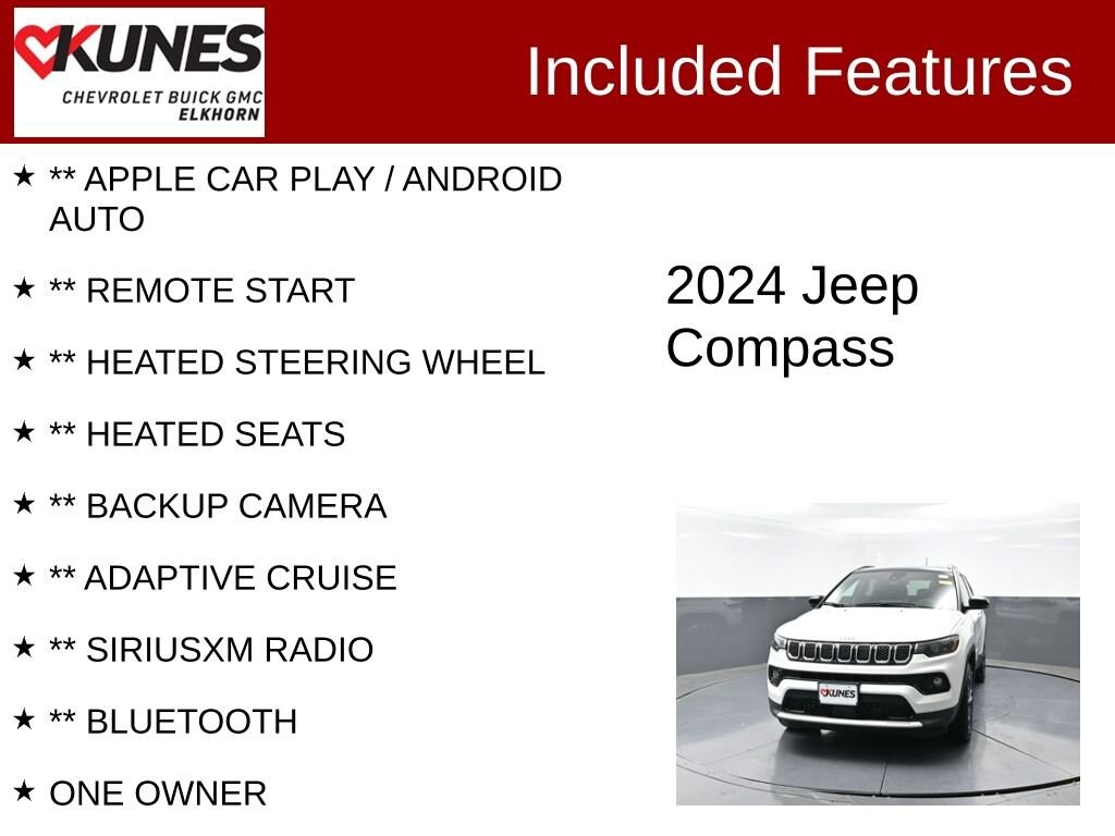 2024 Jeep Compass Limited 2.0L I4 DOHC 8-Speed Automatic 4WD Clean CARFAX. CARFAX One-Owner. 24/32 City/Highway MPG