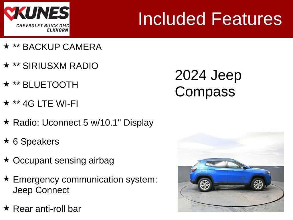 2024 Jeep Compass Latitude Hydro Blue Pearlcoat 4WD 2.0L I4 DOHCRecent Arrival! Clean CARFAX. CARFAX One Owner. Hydro Blue Pearlcoat exterior Premium sound system Blind spot monitoring Lane departure warning and lane keeping assist Backup camera Heated mirrors and power mirrors Bluetooth connection Keyless entry and keyless start Remote start system Satellite radio, HD radio, and auxiliary audio input WiFi hotspot and smart device integration Rear parking sensors and cross-traffic alert Automatic full-time four-wheel drive 2.0L turbocharged engine with 8-speed automatic transmission Dual-zone climate control and air conditioning Touchscreen display with steering wheel audio controls Adjustable, 6-way driver and passenger seats Rear pass-through seat and rear bench seat Aluminum wheels and privacy glass Fog lamps, LED headlights, and automatic highbeams Electronic stability and traction control systems