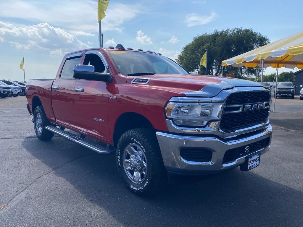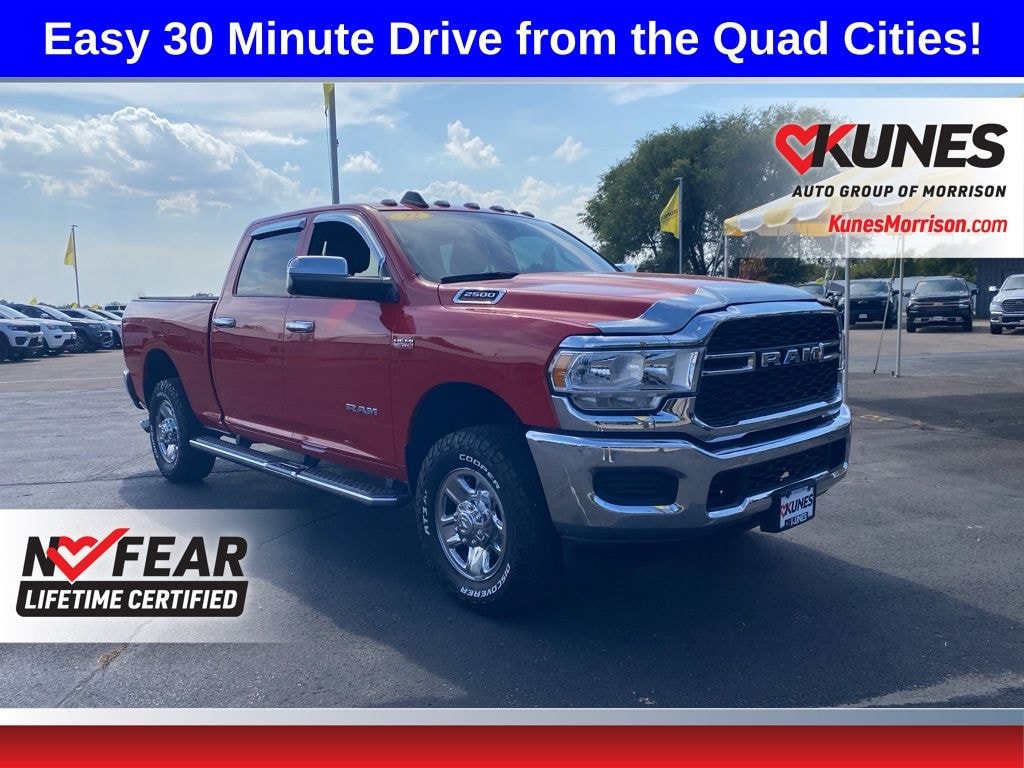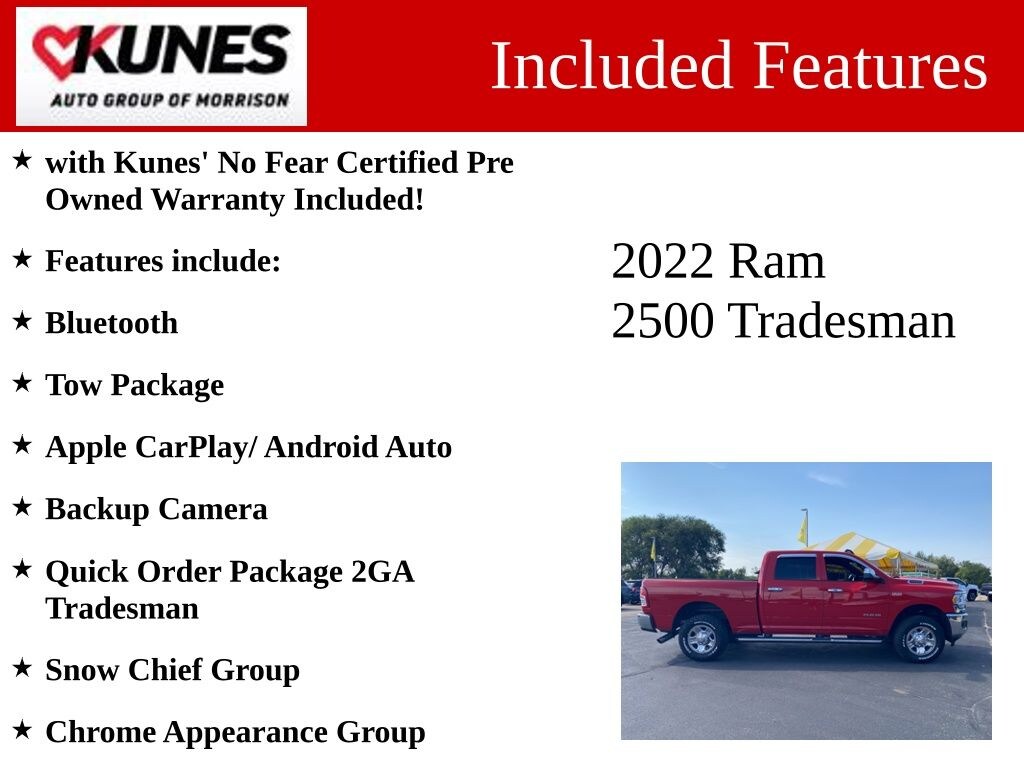 Flame Red Clearcoat 2022 Ram 2500 Pricing includes $2000 Trade In Assistance, and incentive to finance with Dealership. Must trade in 10 year or newer vehicle with less than 100,000 miles. with Kunes' No Fear Certified Pre Owned Warranty Included!, Features include:, Bluetooth, Tow Package, Apple CarPlay/ Android Auto, Backup Camera, 2500 Tradesman, 4D Crew Cab, 6.4L V8, 4WD, Flame Red Clearcoat, Diesel Gray/Black Vinyl, 220 Amp Alternator, Anti-Spin Differential Rear Axle, Bright Front Bumper, Bright Rear Bumper, Center Hub, Chrome Appearance Group, Chrome Grille Surround, Clearance Lamps, Dash Pass Thru Wire Circuits, Digital Rearview Mirror, I/P Mounted Auxiliary Switches, Matte Black Mesh Grille w/Chrome, Quick Order Package 2GA Tradesman, Snow Chief Group, Tow-Mode Camera (Wired) (DISC), Tow-Mode Digital Rearview Mirror Package (DISC), Wheels: 18" x 8.0" Steel Chrome Clad. Odometer is 16583 miles below market average! Priced below KBB Fair Purchase Price!