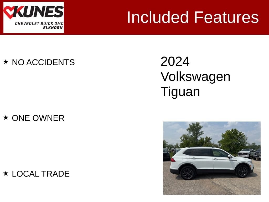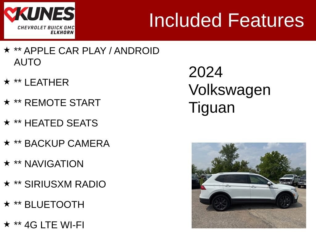 ** APPLE CAR PLAY / ANDROID AUTO, ** LEATHER, ** REMOTE START, ** HEATED SEATS, ** BACKUP CAMERA, ** NAVIGATION, ** SIRIUSXM RADIO, ** BLUETOOTH, ** 4G LTE WI-FI, NO ACCIDENTS, ONE OWNER, LOCAL TRADE.Certified. Certification Program Details:** NO FEAR LIFETIME CERTIFIED PREOWNED **Over $2,895 of value at no cost!*LIFETIME WARRANTY!*3 Day Exchange Policy!*Complimentary powertrain warranty with ability to upgrade to fully comprehensive coverage and/or extend up to 125,000 miles!*125+ Point Inspection by our factory trained ASE Certified technicians and reconditioned to the highest standards.*Complimentary AutoCheck History Report*Complimentary AutoCheck Buyback Protection*Financing for Everyone - Guaranteed credit approval regardless of credit history!*Over 30 lenders who compete to get you the best financing terms*No payments for up to 90 days!*Weekly, Bi-Weekly, and Monthly Payment Options for all buyers!*First Free Oil Change!*Trade anytime policy - cars, trucks, boats, RVs, motorcycles - as long as we donât have to feed it, you can trade it!2024 Volkswagen Tiguan 2.0L TSI DOHC 8-Speed Automatic with Tiptronic FWD Clean CARFAX. CARFAX One-Owner.Find out why our dealerships have won DealerRater.com DEALER OF THE YEAR a whopping 10 TIMES! Call, email, or live chat with one of our friendly sales professionals now to schedule your test drive! Ask about some of our other Chevrolet, GMC, Buick, Ford, Chrysler, Dodge, Jeep, Ram, Tesla, Kia, Hyundai, INFINITI, BMW, Mercedes, Toyota, Lexus, Nissan, Volkswagen, Hummer, Lincoln, Mazda, Mitsubishi, Honda, Acura, and other vehicles that may have navigation, sunroof, adaptive cruise control, leather, cooled seats, blind spot monitor, lane keep assist, panoramic moonroof, tow hitch, Bose audio, Harman Kardon, Sony, remote start, AWD, all wheel drive, 4x4, wireless charging, sirius XM, heated seats, heated steering wheel, V8, diesel, chrome, bed-liner, luggage rack, sensing, power folding mirrors, 5th wheel, gooseneck, autopilot, self-driving, EV, remote locking tailgate, LT, LTZ, High Country, LX, EX, EX-L, DVD, rear entertainment, rear bucket seats, S, SV, SL, premium, black edition, soft top, hard top, convertible, rally stripes, GT, Shelby, Z71, XL, XLT, Lariat, Denali, SLT, SLE, RS, Rebel, Preferred, Premier, Essence, Limited, Luxury, and more. Prices shown do not include tax, title, registration and $499 service fees.